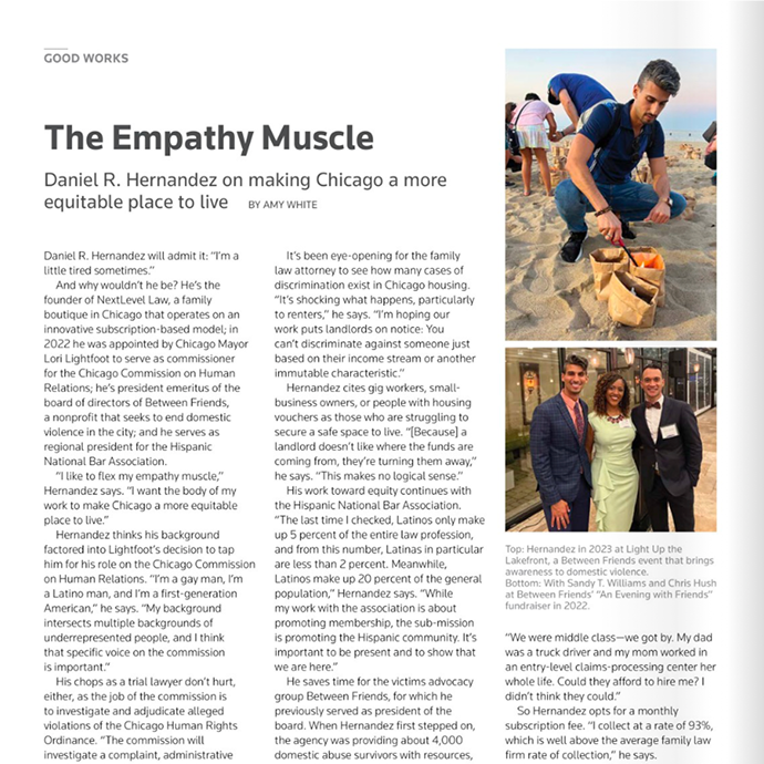 Daniel’s dedication to community service is evident through his extensive volunteer work. He serves as a Commissioner on the Chicago Commission on Human Relations and is the President Emeritus of the Board of Directors at Between Friends, a nonprofit focused on ending domestic violence. He is also actively involved with the Hispanic National Bar Association, where he holds various leadership positions.